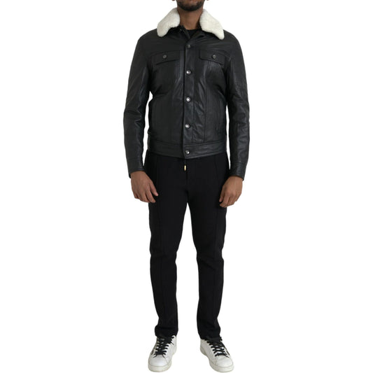 جاكيت بايكر من دولتشي آند غابانا مصنوع من الجلد الأسود مع ياقة من الفرو
