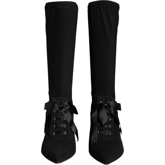 Dolce & Gabbana Black Lace Stretch Heels Mid Calf Boot Shoes