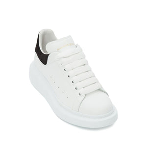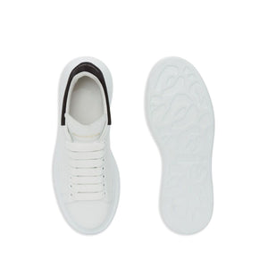 Oversized low-top sneakers from Alexander McQueen featuring white/black, calf leather, perforated detailing, contrasting heel counter, logo-print tongue, round toe, front lace-up fastening, oversize rubber sole, branded insole and These sneakers come with two pairs of interchangeable laces; one is solid-white and the other is flecked.. Oversize leather sneakers Size and Fit - Heel 1,6 in / 4 cm; Platform 1,2 in / 3 cm.