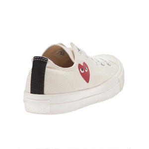 Lo sneaker in white from Converse Comme des Garçons Play. This canvas shoe features a cap toe, lace up detail, and flat rubber sole. Sold as women's US sizing. Chuck Taylor Red Heart sneakers Size and Fit - Heel 1,2 in / 3 cm; Platform 1 in / 2,5 cm.