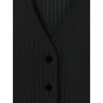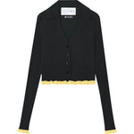 x Ester Manas ribbed cropped cardigan from AZ FACTORY featuring black, ribbed knit, V-neck, spread collar, front button fastening, long sleeves, contrasting border, scallop hem and cropped. Cropped top Size and Fit - This piece fits true to size. We recommend you get your regular size. Model is 1,75m / 5ft 8in wearing size S