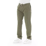Elevate your style with Baldinini Trend’s precisely tailored chino trousers. Designed for the modern man, these pants feature a sharp front zipper and button closure, complemented by sleek side pockets and refined back welt pockets. Fashioned from premium 100% cotton for unmatched comfort and durability, each pair promises to enhance your ensemble with its chic army color. These trousers are a testament to Baldinini’s commitment to luxury and style perfection.