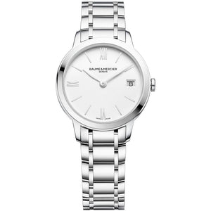 This stainless steel BAUME & MERCIER wristwatch is a timeless beauty. With a 31mm case and a water resistance of 5 ATM, it is perfect for everyday wear. The quartz movement and sapphire dial create a reliable and accurate timepiece. Made in Switzerland, it is a perfect accessory for any lady looking for both style and functionality.