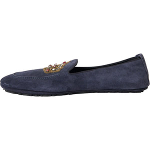 Dolce & Gabbana Blue Leather Suede Crystal Crown Loafers Shoes