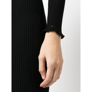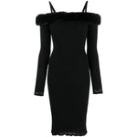 off-shoulder ribbed midi dress from BLUMARINE featuring black, ribbed knit, velvet trim, off-shoulder, adjustable spaghetti straps, long sleeves, below-knee length and scallop edge. Faux fur neck midi dress Size and Fit - This piece fits true to size. We recommend you get your regular size. Model is 1,75m / 5ft 8in wearing size S