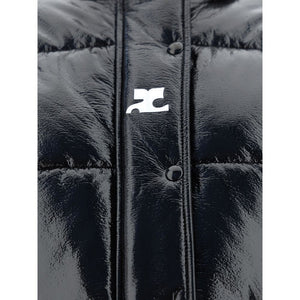 Crop Down Jacket by Courrèges, double-slider front zipper closure, high collar, all-over padded and quilted design, two zippered side welt pockets, elastic ribbed cuffs, regular fit, iconic contrasting brand logo on front.