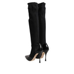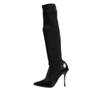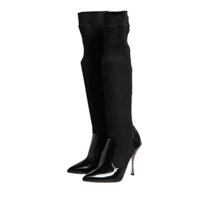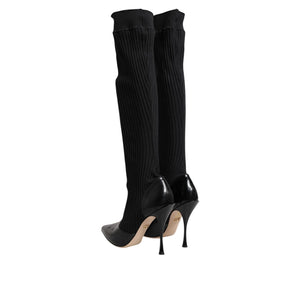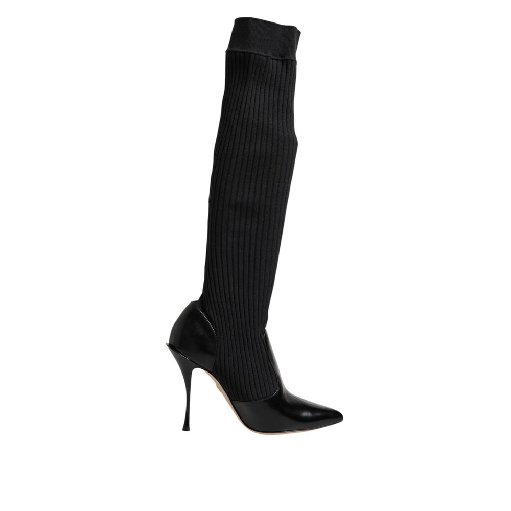 Dolce & Gabbana Black Leather Ribbed Knit Knee Boots Shoes