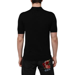Dolce & Gabbana Black Wool DG Logo Rose Collared Polo T-shirt