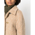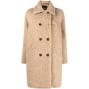 Jacqueline double-breasted coat from FAY featuring camel brown, wool blend, gold-tone hardware, spread collar, double-breasted button fastening, hook fastening, long sleeves, slip pockets to the sides and straight hem. Double-breasted wool blend coat Size and Fit - This piece fits true to size. We recommend you get your regular size. Model is 1,75m / 5ft 8in wearing size S
