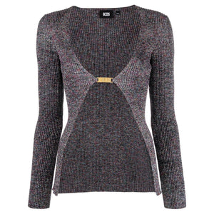 glittered V-neck cardigan from GCDS featuring dark grey, knitted construction, glitter detailing, V-neck, clasp fastening, long sleeves and straight hem. Logo lurex cardigan Size and Fit - This piece fits true to size. We recommend you get your regular size. Model is 1,75m / 5ft 8in wearing size S