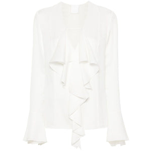 white silk semi-sheer construction signature 4G monogram jacquard ruffled trim plunging V-neck flounce sleeves with buttoned cuffs straight hem Silk ruffled blouse Size and Fit - This piece fits true to size. We recommend you get your regular size. Model is 1,75m / 5ft 8in wearing size 36 (FR)