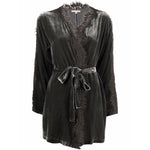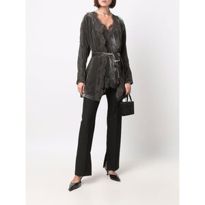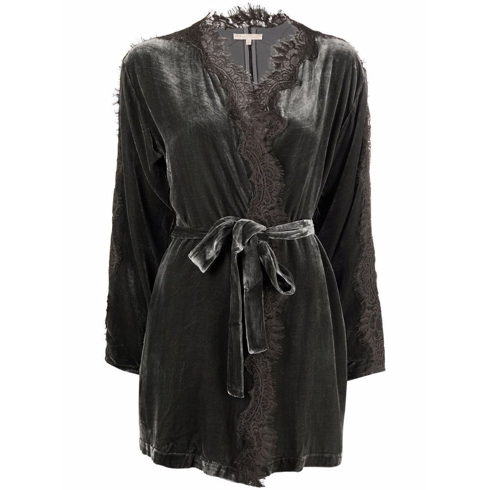 Dark grey lace-trim belted coat from GOLD HAWK featuring lace trim, V-neck, long sleeves, tied waist and two side slit pockets. Velvet long duster Size and Fit - This piece fits true to size. We recommend you get your regular size. Model is 1,75m / 5ft 8in wearing size S