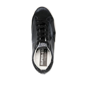 black calf leather signature star patch to the sides logo print to the side glitter detailing front lace-up fastening round toe flat rubber sole Super-Star leather sneakers Size and Fit - Heel 1,6 in / 4 cm Platform 1 in / 2,5 cm