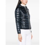 navy blue feather down padded design quilted gold-tone logo plaque logo-engraved gold-tone hardware detachable drawstring hood front two-way zip fastening long sleeves elasticated cuffs two side zip-fastening pockets elasticated hem quilted lining Nylon short down jacket Size and Fit - This piece fits true to size. We recommend you get your regular size. Model is 1,75m / 5ft 8in wearing size 40 (IT)