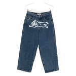 medium-wash blue embroidered dog motif five-pocket styling button fly straight leg cotton construction Running Dog denim jeans