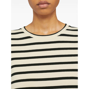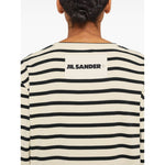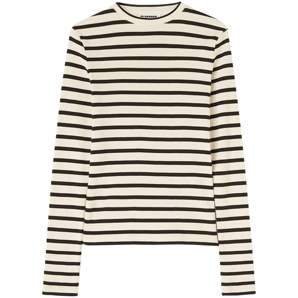 stripe-print cotton T-shirt from JIL SANDER featuring off-white, black, cotton, fine ribbed, horizontal stripe pattern, crew neck, long sleeves, logo patch to the rear and straight hem. Striped cotton t-shirt Size and Fit - This piece fits true to size. We recommend you get your regular size. Model is 1,75m / 5ft 8in wearing size S