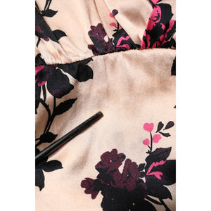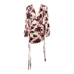 Laneus Pink Floral Silk Long Sleeves V-neck Ruched Mini Dress