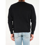 Black crew neck sweater with long sleeves in cotton. It has a contrasting all-over Off White logo. Ribbed collar, hem and cuffs. The model is 184 cm tall and wears a size M.