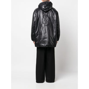 Cassandre Anorak oversized hooded coat from SAINT LAURENT featuring jet black, padded design, glossy finish, embroidered logo to the rear, slouchy drawstring hood, half front zip fastening, two side welt pockets, drop shoulder, long sleeves, elasticated cuffs and drawstring hem. Nylon blouson Size and Fit - This piece fits true to size. We recommend you get your regular size. Model is 1,84m / 6ft 1in wearing size 48 (IT)
