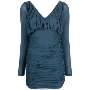 V-neck draped mini dress from SAINT LAURENT featuring blue, draped design, V-neck, V-back, long sleeves, curved hem and thigh-length. Short jersey dress Size and Fit - This piece fits true to size. We recommend you get your regular size. Model is 1,75m / 5ft 8in wearing size 36 (FR)