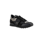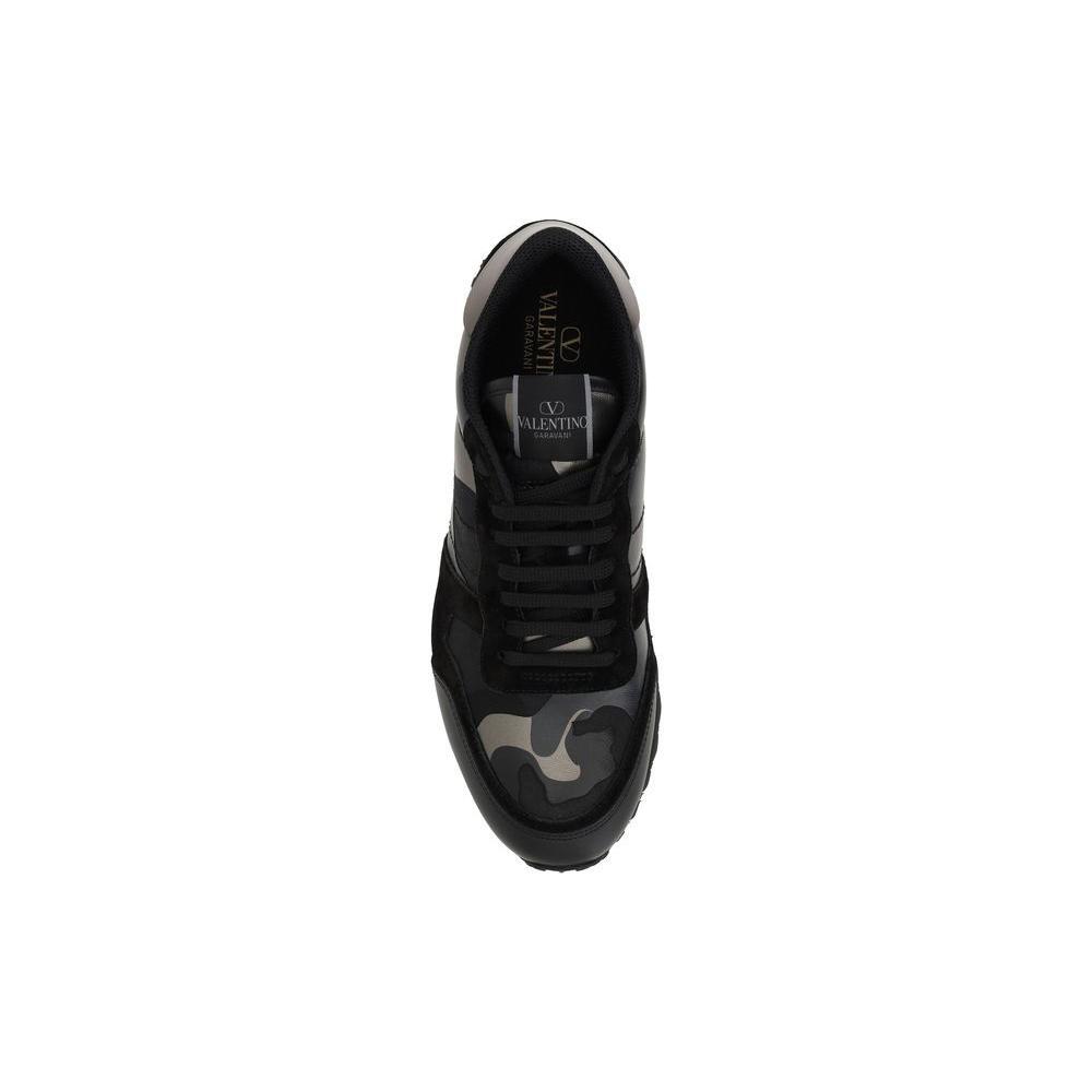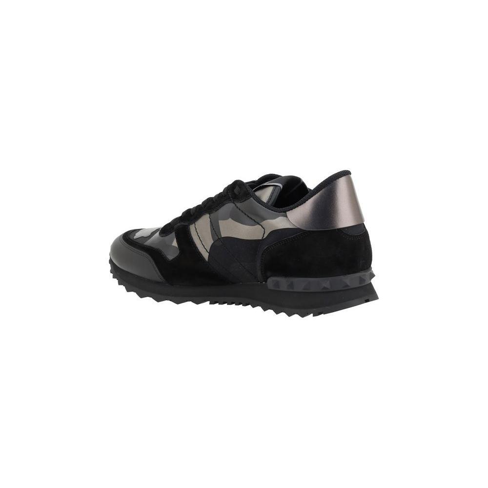 Leather sneakers by Valentino Garavani, lace-up front closure, suede detailing, camouflage pattern, textured knurled sole, contrasting logo insole.