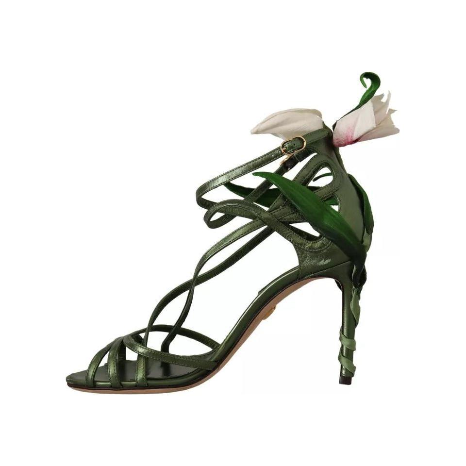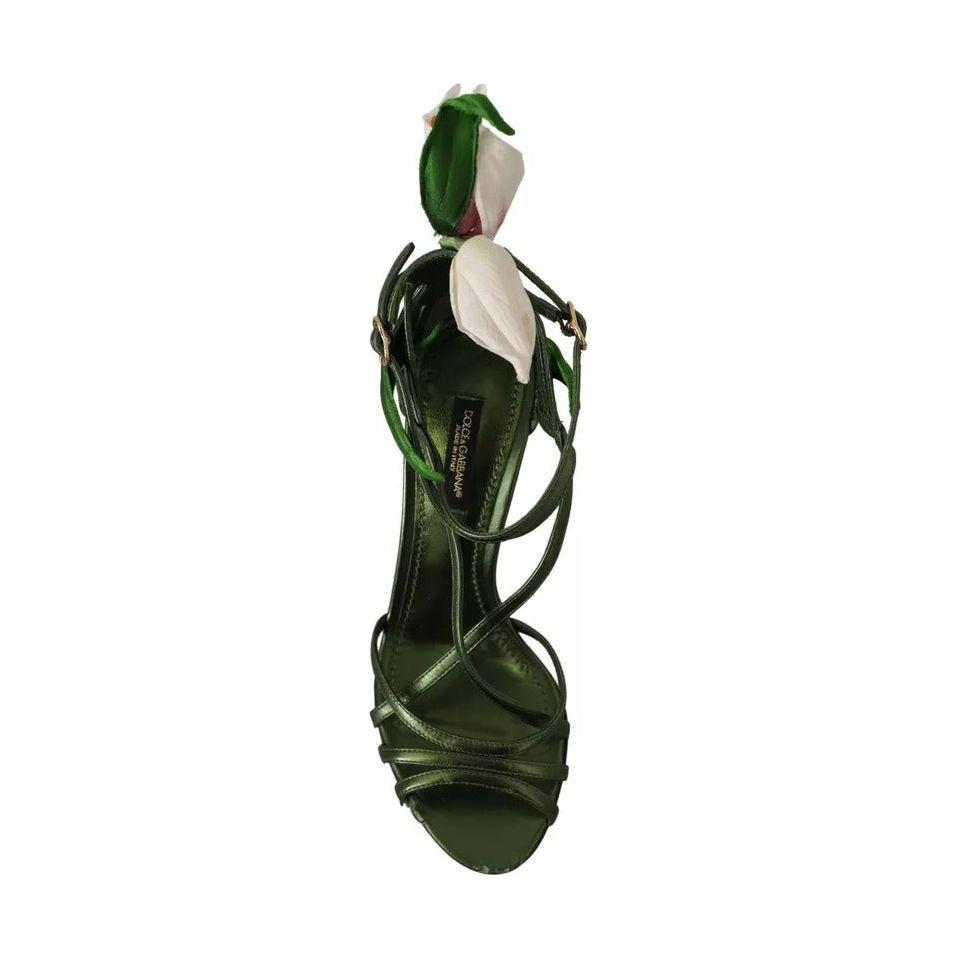 Dolce & Gabbana Acid Green Leather Strappy Flower Heels Sandals Shoes