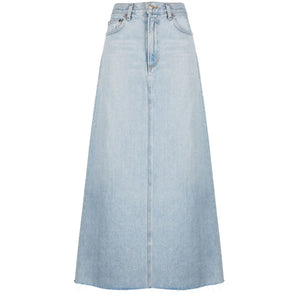 maxi denim skirt from AGOLDE featuring light blue, organic cotton, mid-rise, belt loops, frayed edge, central rear vent, front button and zip fastening, classic five pockets and ankle-length. This item is made from at least 50% organic materials.. Learn more about what makes a product Conscious on our Conscious Criteria page. Denim maxi skirt Size and Fit - This piece fits true to size. We recommend you get your regular size. Model is 1,75m / 5ft 8in wearing size 27 (WAIST CM)