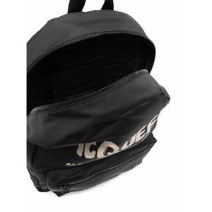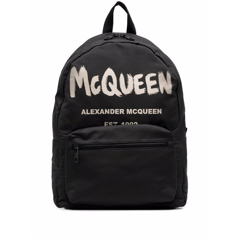 Black/ivory-white Graffiti Metropolitan printed backpack from Alexander McQueen featuring graffiti print, logo print to the front, single top handle, two adjustable shoulder straps, top zip fastening and front zip-fastening compartment. Graffiti Metropolitan backpack Size and Fit - Width 11,42 in / 29 cm