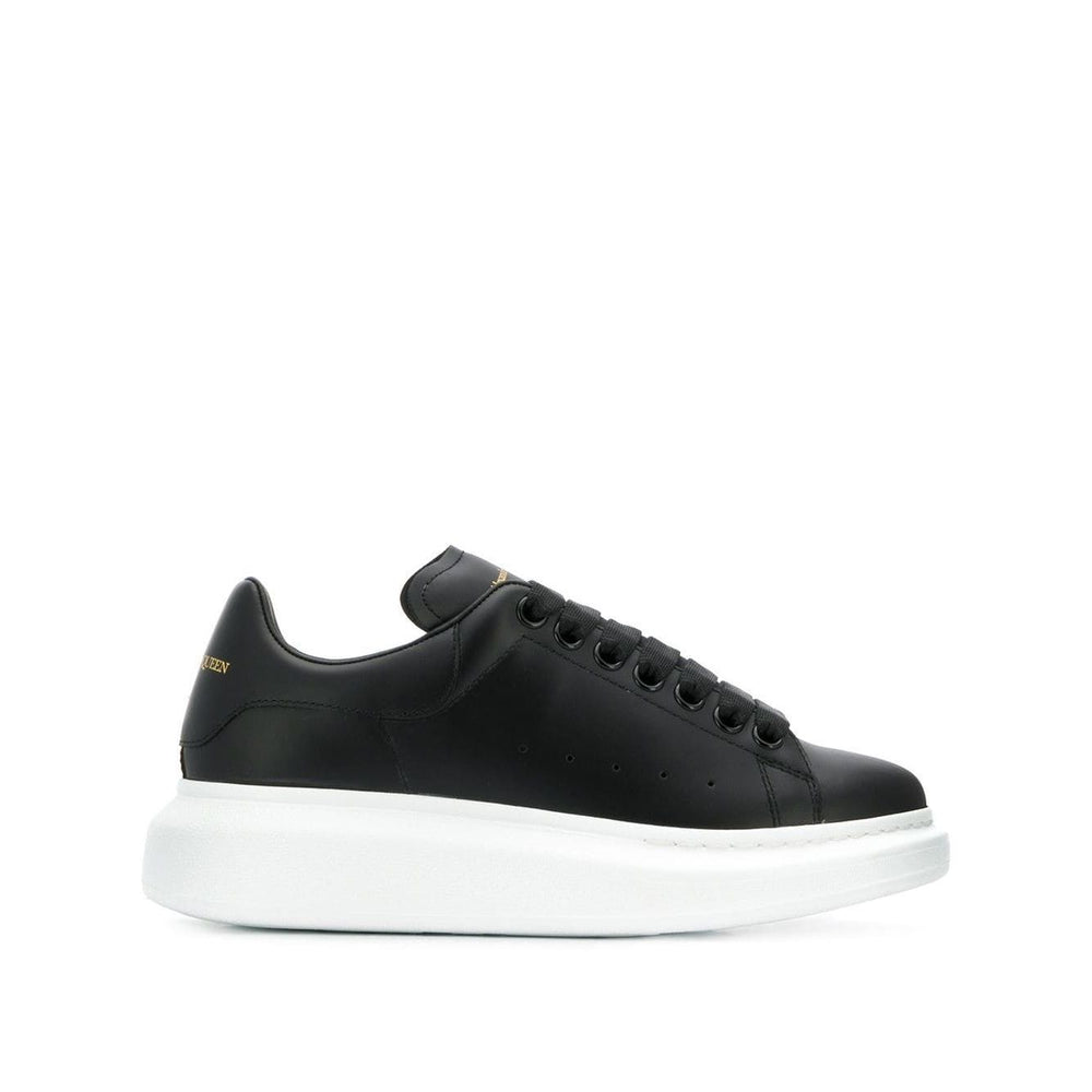 Black leather Oversized low-top sneakers from Alexander McQueen featuring branded heel counter, logo-print tongue, round toe, front lace-up fastening and flat rubber sole. Oversized leather sneakers Size and Fit - Heel 1,8 in / 4,5 cm; Platform 1,4 in / 3,5 cm