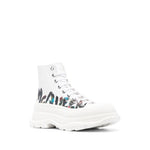 Dal suo debutto nel 2019, lo stile Tread Slick di Alexander McQueen è stato aggiornato in più tonalità. Questa iterazione di sneaker high-top presenta una suola spessa caratteristica del design e una stampa del logo Graffiti, una firma del marchio. Tread Slick ankle boots Size and Fit - Heel 5,9 in / 15 cm; Platform 1,2 in / 3 cm