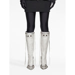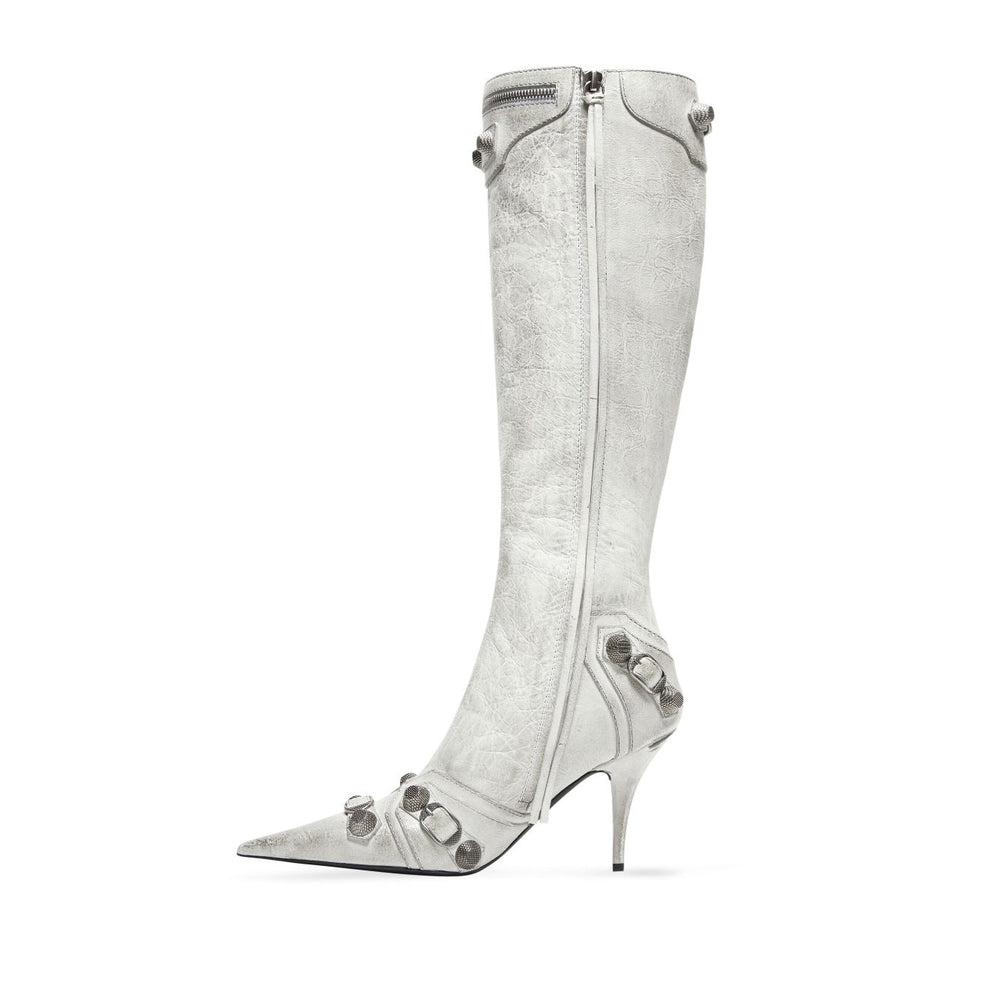 Cagole point-toe boots from BALENCIAGA featuring optical white, lambskin, pointed toe, stud embellishment, zip details, silver-tone hardware and stiletto heel. Le Cagole leather boots Size and Fit - Heel 9 cm