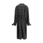 Balenciaga’s Long Coat is a statement piece that combines elegance and character. Crafted from wool with a refined checked design, it features welt pockets on the front and distinctive details such as belt loops on the collar and sleeve. The front belt closure enhances the silhouette, while the classic collar without a hood lends timeless elegance.