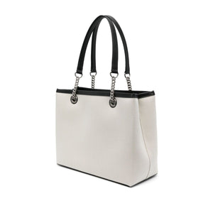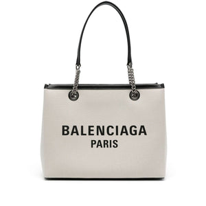 Beige shopping bag, with logo on the front, unique compartment, internal zip pocket, two handles, open upper part, silver finishes. Duty Free medium tote bag Size and Fit - Width 13,78 in / 35 cm