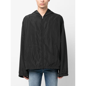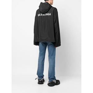 logo-print hooded windbreaker from BALENCIAGA featuring black/white, lightweight construction, logo print to the rear, classic hood, front two-way zip fastening, drop shoulder, long wide sleeves, drawstring cuffs, internal zip-fastening pockets, two side zip-fastening pockets, drawstring hem and mesh lining. Nylon zipped jacket Size and Fit - This piece fits true to size. We recommend you get your regular size. Model is 1,75m / 5ft 8in wearing size 1 (NUM)