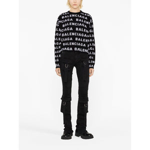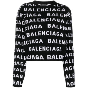 intarsia-logo crew-neck jumper from BALENCIAGA featuring black/white, wool blend, intarsia-knit logo, crew neck, drop shoulder, long sleeves and ribbed cuffs and hem. We've partnered with Good On You — an independent agency that rates how brands perform in relation to their impact on the planet, people and animals, with a multi-criteria rating simplified to a five points scale. In order to be awarded our conscious label, larger brands need to score a minimum of four out of five ('Good'), while smaller brands must score at least three out of five ('It's a start'). This item comes from a brand rated four out of five ('Good') by Good on You. Please note, this is a brand-level rating and does not guarantee that this product is made with conscious materials.. Learn more about what makes a product Conscious on our Conscious Criteria page. Allover logo wool cropped sweater Size and Fit - This piece fits true to size. We recommend you get your regular size. Model is 1,75m / 5ft 8in wearing size S