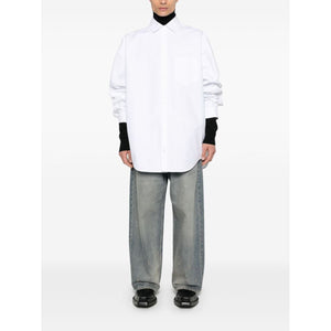 white cotton classic collar chest patch pocket drop shoulder long sleeves press-stud fastening cuffs two side slit pockets curved hem front press-stud fastening When buying this unisex item, keep in mind that it is graded in standard men's sizing. Oversized cotton shirt Size and Fit - SLEEVE LENGTH: 92.0 Centimetres. LENGTH: 95.0 Centimetres.