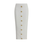 Balmain’s midi Skirt enhances the silhouette with a ribbed and twisted knit, giving structure and movement to the garment. On the front, the characteristic decorative "Coin" buttons in gold metal, the house’s iconic signature, stand out. The back closure is entrusted to an exposed double zipper in gold metal, with sliders engraved "Balmain Paris." Contrasting ribbed trim completes the design for a sophisticated and recognizable look.