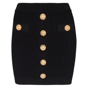 buttoned knitted mini skirt from Balmain featuring black, knitted construction, high waist, ribbed waistband, rear zip fastening, embossed gold-tone buttons and thigh-length. High waist buttoned mini skirt Size and Fit - This piece fits true to size. We recommend you get your regular size. Model is 1,75m / 5ft 8in wearing size 36 (FR)