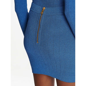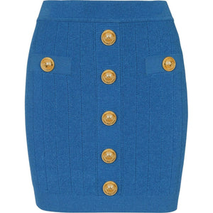 buttoned-short-knit-pencil-skirt from Balmain featuring blue, knitted construction, pencil silhouette, embossed gold-tone buttons, decorative button detailing, front flap pockets and short rear zip fastening. Embossed-buttons knit mini skirt Size and Fit - This piece fits true to size. We recommend you get your regular size. Model is 1,75m / 5ft 8in wearing size 36 (FR)