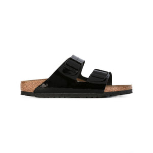 Black, artificial leather, patent coating, double-strap design, tonal buckle fastening, branded insole, moulded footbed, flat rubber sole. Airzona Birko flor leather sandals Size and Fit - Narrow width