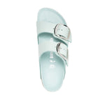 aqua blue leather smooth grain high-shine finish round open toe logo-engraved buckle-strap fastening branded leather footbed suede lining silver-tone hardware Arizona Big Buckle sandals Size and Fit - Narrow width