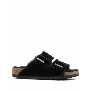 black suede open toe side buckle fastening shearling lining branded insole rubber sole Arizona shearling sandals Size and Fit - Narrow width