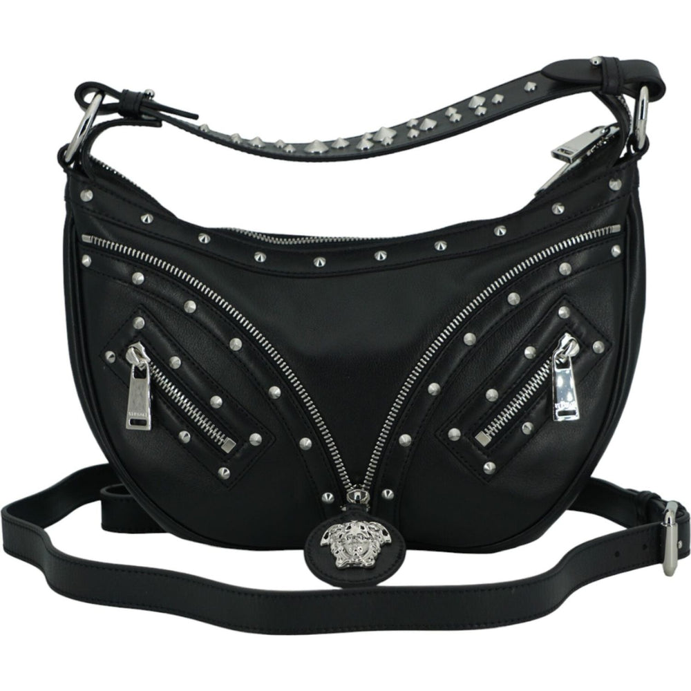 范思哲小号流浪包单肩包是奢华的典范,完美融合了时尚与实用性,是时尚前卫人士的理想之选。惊艳的黑色小牛皮结构搭配时尚的银色美杜莎头像标志,体现了该品牌的标志性设计美学。其紧凑而宽敞的内部空间拥有安全的拉链开合,一个主隔层和一个内部拉链口袋,所有这些都旨在让您在旅途中有序存放必需品。
