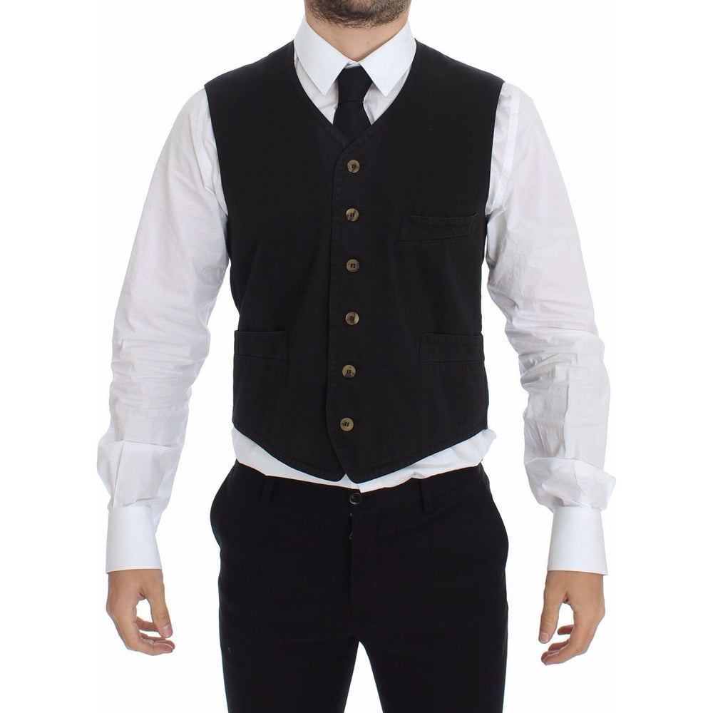 穿上这款绝对令人惊艳的正宗 Dolce & Gabbana 黑色正装背心,彰显您的风格。这款单排扣背心非常适合搭配正式服装,配有精致的可调节后腰带,确保合身合体。它拥有时尚的全纽扣前开襟,并饰有精致的徽标细节,散发着品牌的奢华气息。它由意大利精工制作,将时尚与舒适融为一体,可提升任何服装的档次。