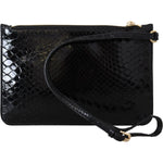 这款精美的黑色腕带钱包采用蟒蛇纹和细致的意大利工艺,让您尽享 Dolce & Gabbana 的奢华。这款令人惊叹的配饰配有拉链开合、内置镜子和舒适的腕带,饰有金色金属细节和标志性徽标。这款小巧而优雅的单品是您必备品的完美之选。