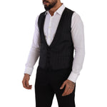 这款令人惊叹的 100% 正品 Dolce & Gabbana 单排扣正装背心让您步入奢华世界。它非常适合彰显精致风格,采用光滑的黑色条纹图案,散发出优雅和精致的气息。纯羊毛、丝绸和涤纶的精致组合确保了极致的舒适性和耐用性。这款背心在意大利精心制作,是时尚和优质品质的体现,可提升任何正式服装的档次。