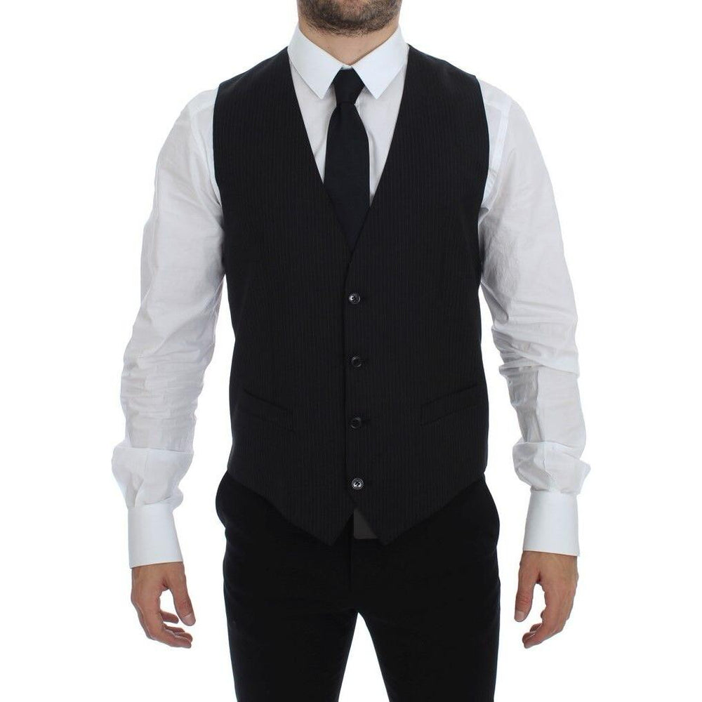 这款绝对令人惊艳的 100% 正品 Dolce & Gabbana 正装背心散发出精致气质。这款来自 MainLine 系列的黑色条纹单排扣背心剪裁完美,可提升任何正式服装的档次。这款意大利制造的背心饰有徽标细节和可调节的后腰带,可定制合身度,堪称时尚典范。