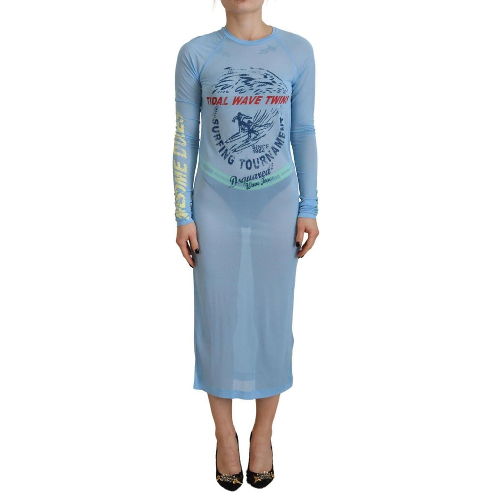蓝色印花粘胶纤维长袖罩衫连衣裙