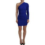 蓝色粘胶纤维单肩紧身褶饰迷你连衣裙