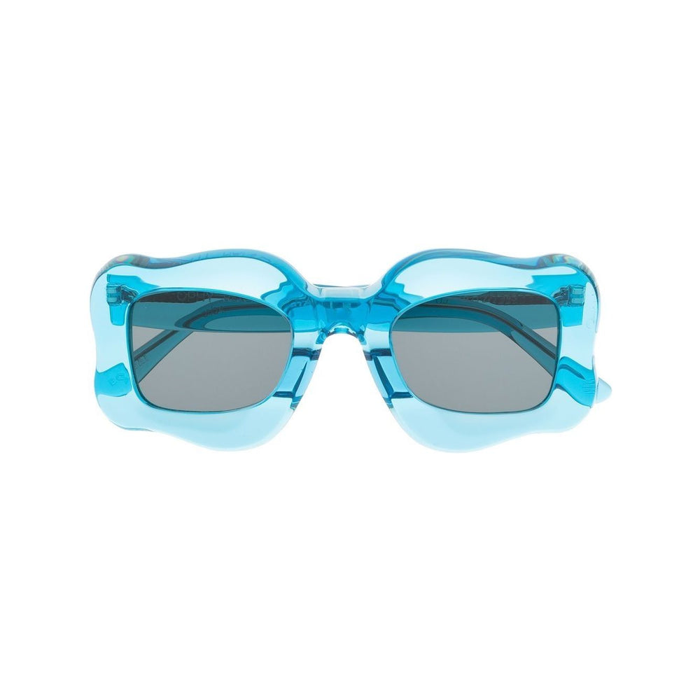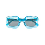 oversized curved-frame sunglasses from Bonsai featuring blue zircon, transparent design, oversize frame, curved corners, tinted lenses, logo print at the arm and straight arms. These glasses come with a protective case.. Happy sunglasses Size and Fit - Arm Length: 14.5 Centimetres. Bridge Width: 2.7 Centimetres. Lens Diameter: 4.8 Centimetres. Total Width: 13.5 Centimetres.